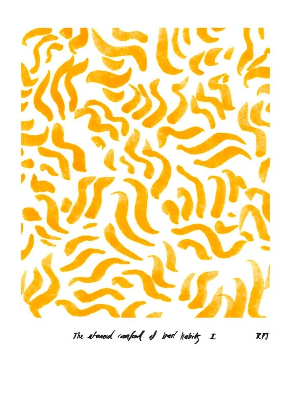 Das „Comfort – Yellow“-Poster von Paper Collective stellt eine Interpretation wie vom Flugzeug aus gesehener, sich schnell verändernder Landschaften dar. Das mit gelber Tinte gemalte Poster ist Teil einer Sammlung abstrakter Landschaften der südafrikanischen Künstlerin Ronelle Pienaar Jenkin und des Studio Lemon.
