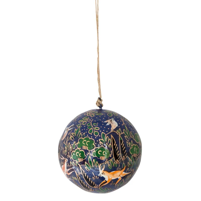 Die Deer-Weihnachtskugel von Tikau verbreitet eine fröhliche und festliche Stimmung in Ihrem Zuhause. Die aus gebrauchtem Zeitungspapier bestehende Weihnachtskugel ziert eine von Hand gemalte märchenhafte Illustration. Die einzigartigen Dekorationsobjekte machen sich hübsch am Baum, die farbenfrohen Weihnachtskugeln können aber auch ins Fenster gehängt oder in einer schönen Schale oder Vase zur Schau gestellt werden.