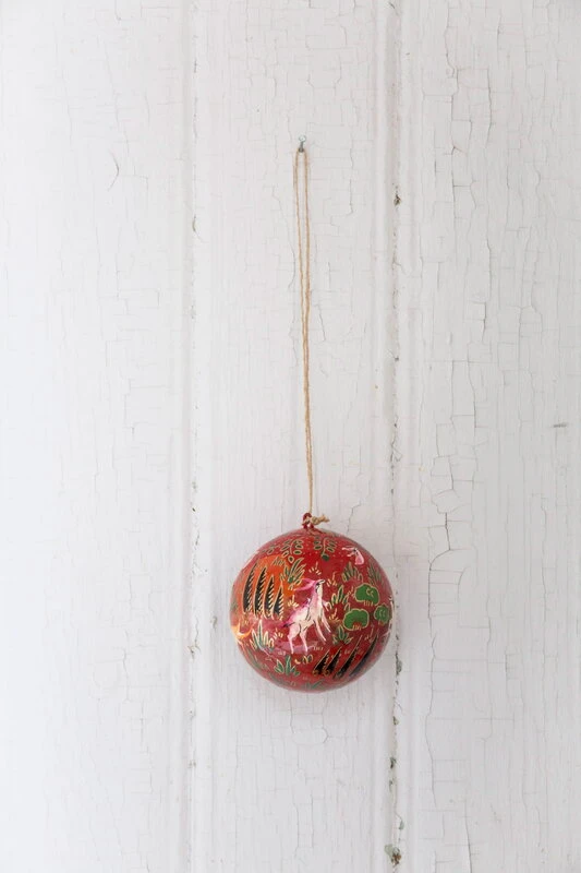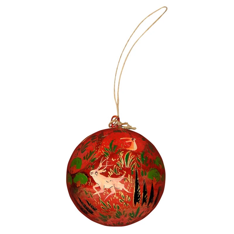 Die Deer-Weihnachtskugel von Tikau verbreitet eine fröhliche und festliche Stimmung in Ihrem Zuhause. Die aus gebrauchtem Zeitungspapier bestehende Weihnachtskugel ziert eine von Hand gemalte märchenhafte Illustration. Die einzigartigen Dekorationsobjekte machen sich hübsch am Baum, die farbenfrohen Weihnachtskugeln können aber auch ins Fenster gehängt oder in einer schönen Schale oder Vase zur Schau gestellt werden.