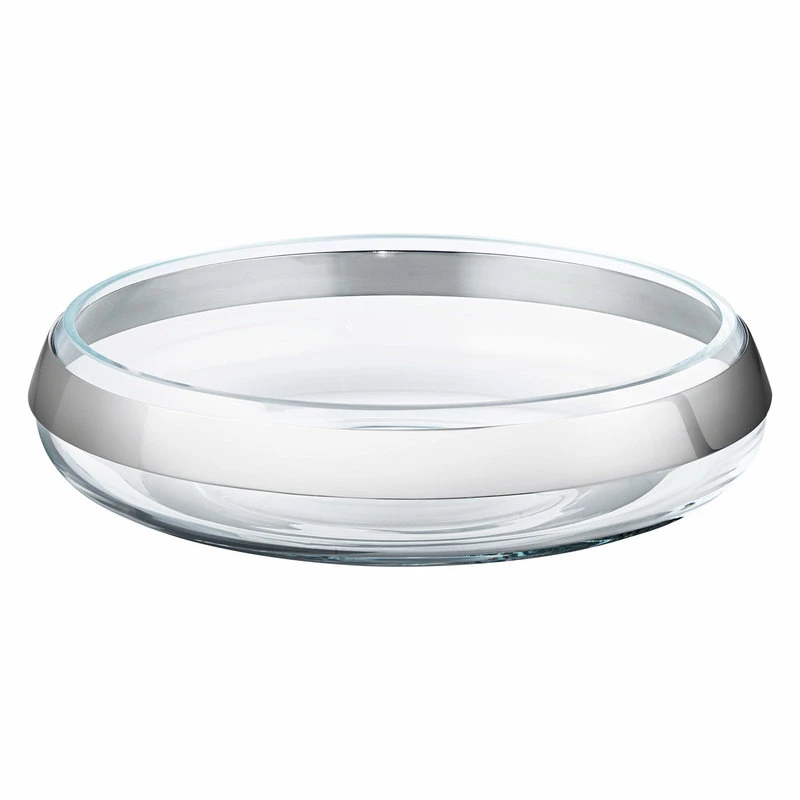 Die Duo-Schale von Georg Jensen kombiniert die Zartheit von Glas mit dem Schimmer hochglanzpolierten Stahls. Die mundgeblasene Schale ist mit einem Stahlring verziert, der wie ein Spiegel die Umgebung der Schale auf faszinierende Weise reflektiert. Der Stahlring ist auch eine Referenz an Georg Jensens langjährige Erfahrung im Schmuckdesign – das Stahlornament erinnert an eine Halskette. Der Stahlring ist abnehmbar, was die Reinigung der Schale erleichtert und die Verwendung der Schale auch ohne die Stahlverzierung ermöglicht.