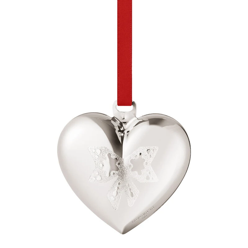 Das elegante Ornament wird mit zwei verschiedenfarbigen Bändern zum Aufhängen geliefert – eines in Rot und eines in Cremeweiß – sodass es sich ganz einfach an einem Baum, einem Zweig in einer Vase oder sogar an einem Türknauf anhängen lässt.