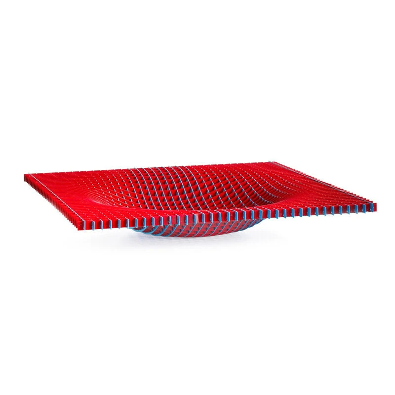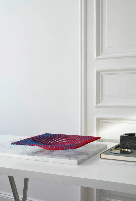 Das Gravity-Tablett von Fundamental Berlin besticht durch seine glänzende, farbenfrohe Oberfläche und sein außergewöhnliches Design. Das dreidimensionale Gefäß wurde von der Science-Fiction und dem Weltraum inspiriert und für das berühmte Centre Pompidou in Paris entworfen. Das Serviertablett besteht aus einem Eisengitter in Rot und Blau – und die Farben verändern sich je nach dem Winkel, aus dem man es betrachtet. Das Tablett ist leicht beweglich, sodass Sie Form und Winkel nach Belieben verändern können. Das wunderschöne Gravity-Tablett macht sich gut als Obstkorb in der Küche, als dekoratives Einzelstück auf dem Wohnzimmertisch oder im Flur auf dem Beistelltisch zur Aufbewahrung von Schlüsseln und anderen Kleinigkeiten.