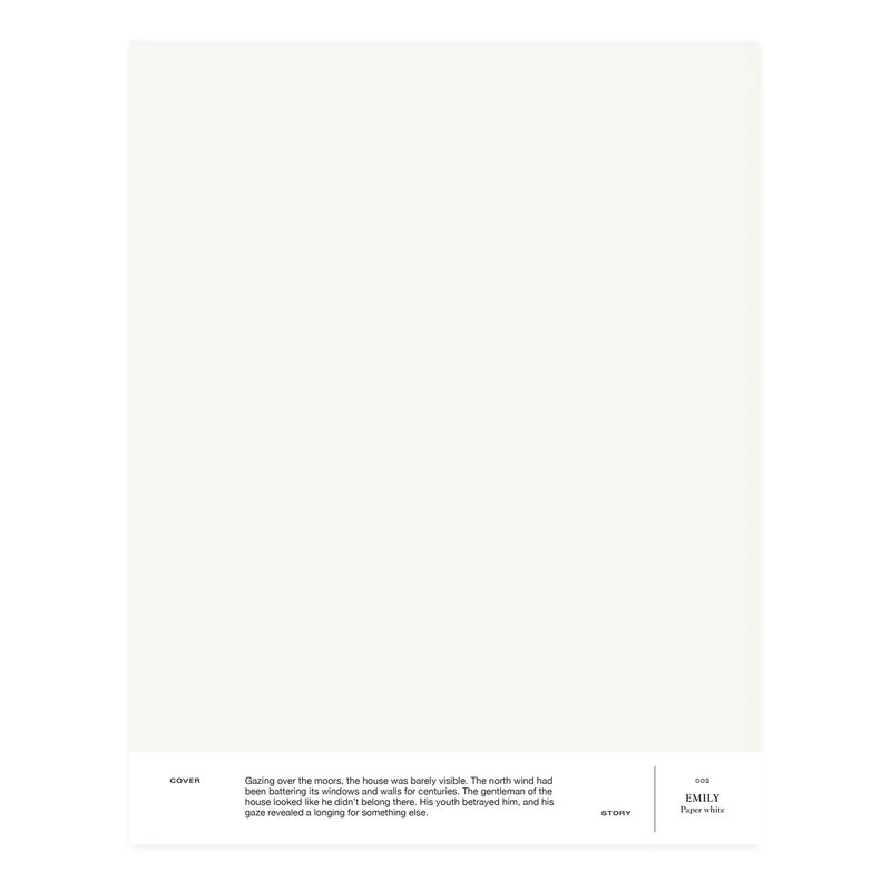 Die Innenfarbe im Farbton 002 Emily ist die Interpretation des klassischen Papierweiß der finnischen Farbenmarke Cover Story und passt perfekt zu Fußleisten und Türen. Die mattglänzende Farbe sorgt für ein glattes, samtig-mattes Finish.
