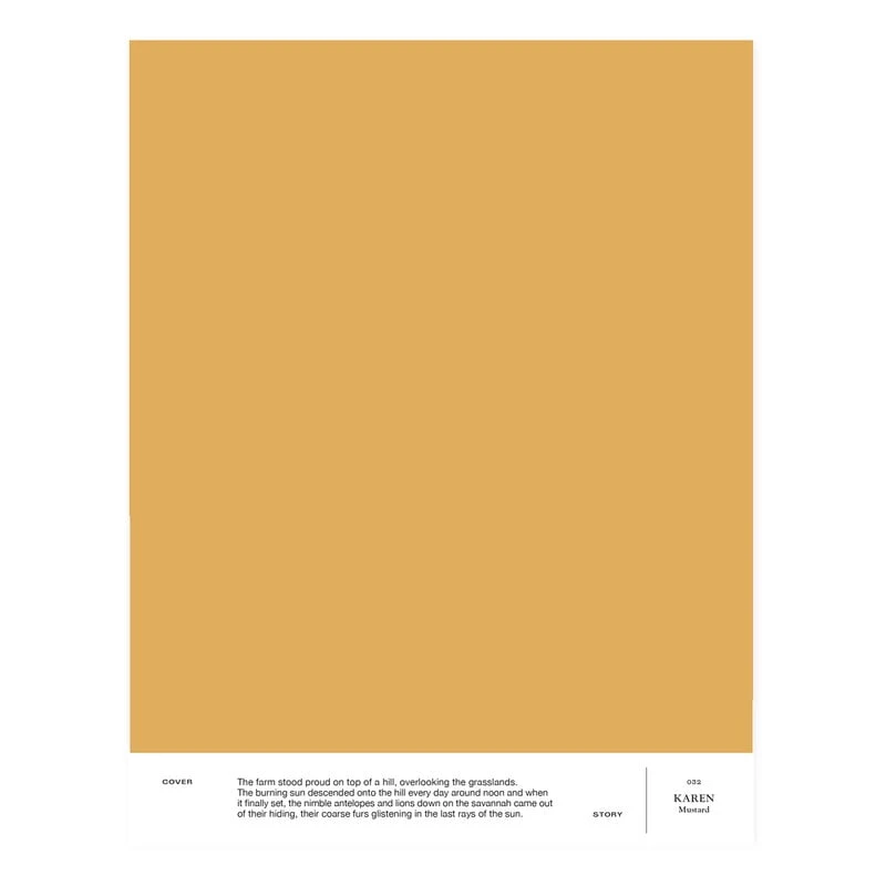 Die Innenfarbe von Cover Story im Farbton 032 Karen ist die perfekte Senffarbe, deren gelb-brauner Ton an die gemütliche Atmosphäre alter Holzhäuser erinnert. Der würzige Ton bildet auch einen schönen Kontrast zu modernen Einrichtungen. Die Farbe erzeugt ein samtig-mattes, nicht reflektierendes Finish.