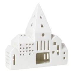 Die City-Laterne aus der Urbania-Serie von Kähler zeigt eine Reihe von städtischen Gebäuden mit einem hohen Kirchturm in der Mitte. Die Oberfläche der Laterne aus Keramik ist wunderschön weiß glasiert.