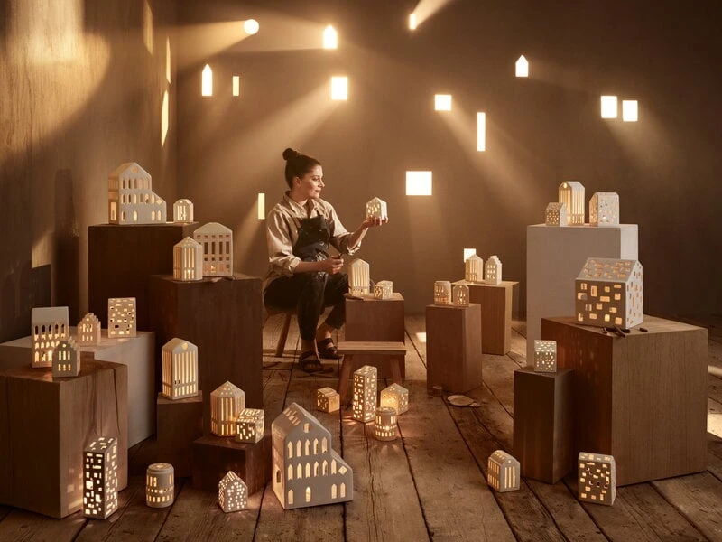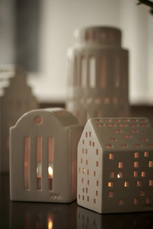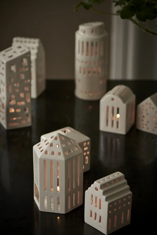 Kählers Urbania-Laternen bieten eine moderne Alternative zu traditionelleren Laternen. Die Keramiklaternen wurden von Mette Bache und Barbara Bendix Becker entworfen und stellen verschiedene Gebäude dar, durch deren unterschiedlich geformte Fenster Kerzenlicht strahlt, das faszinierende Muster auf ihre Umgebung wirft.