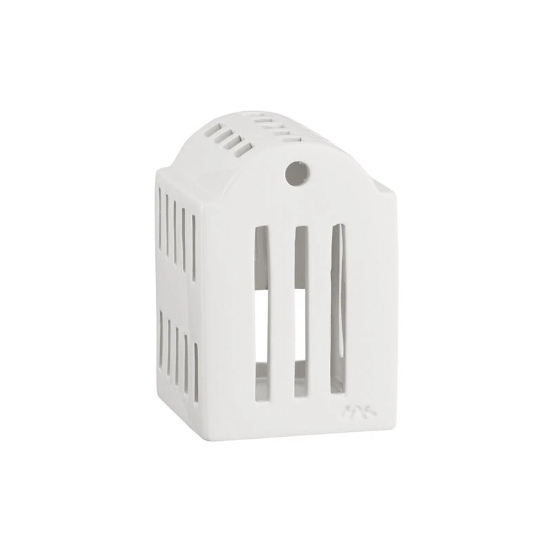 Die Laterne Funkis aus der Urbania-Serie von Kähler ähnelt einem Wohnhaus, dessen asymmetrische Fenster und schräge Decke der Laterne ein interessantes, unverwechselbares Aussehen verleihen. Die Oberfläche der Laterne ist wunderschön weiß verglast.