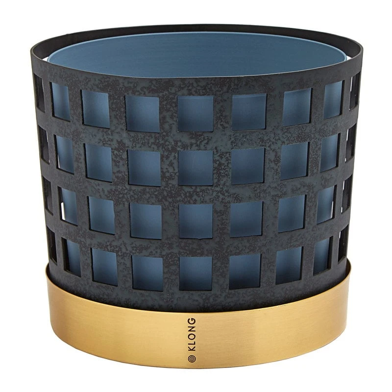 Der Blumentopf Trio von Klong besteht aus drei verschiedenen Elementen: einem blauen Innentopf, einer Stahlschicht mit Lochmuster und einer lackierten Messingschale. Die von Ania Pauser entworfenen Trio-Töpfe bilden einen reizvollen Kontrast zu Grünpflanzen, und die verschiedenen Größen und Farben der Kollektion lassen sich gut kombinieren.