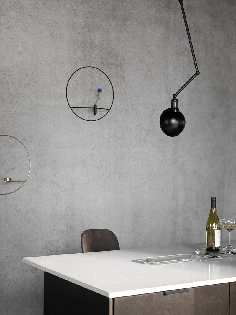 Der Teelichthalter POV Circle von Menu ist ein leichter und verspielter Wandkerzenhalter, der als Einzelstück oder in einer Gruppe verwendet werden kann. Wie vom Namen angedeutet, verändert sich das Aussehen von POV je nach Blickwinkel. Aus einem Blickwinkel wirkt der schlanke geometrische Rahmen wie gezeichnet, aus einem anderen scheint er in der Luft zu schweben. Dank dem Wandel von Form und Schatten macht es Spaß, mit dem Objekt zu interagieren. Die POV-Kollektion wurde von Note Design Studio aus Schweden entworfen.