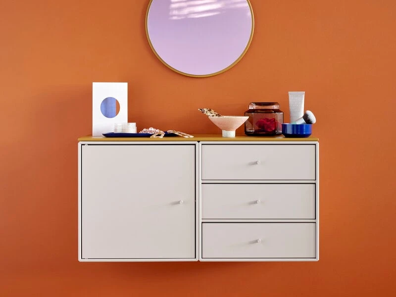 Der Montana-Mini-Spiegel besteht aus einem einfachen, geometrischen Spiegelglas, das auf einer lackierten MDF-Platte angebracht ist. Die Spiegel können einzeln oder in Gruppen an der Wand montiert werden und passen in Farbe und Form perfekt zu den Montana-Mini-Modulen.