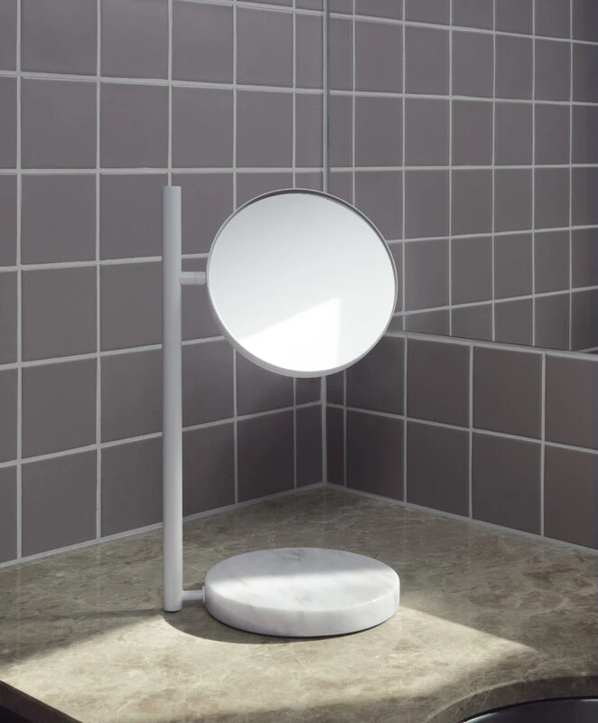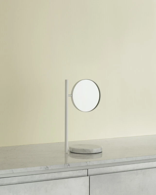 Der Pose-Spiegel von Normann Copenhagen ist ein elegantes und äußerst funktionales Accessoire für das Badezimmer oder das Ankleidezimmer. Der von Simon Legald entworfene Tischspiegel steht auf einem runden Marmorsockel, wodurch das Produkt sowohl in der Struktur als auch im Aussehen ausgewogen ist. Der Ständer bietet außerdem eine stilvolle Ablagefläche für kleine Schmuckstücke und Dekorationsartikel. Die andere Seite des Pose-Spiegels vergrößert, was das Rasieren, Schminken – und das Üben neuer Posen – erleichtert.