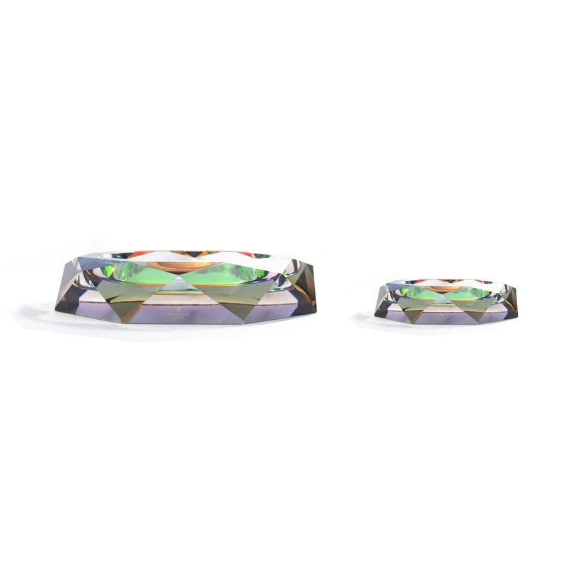 Die Regenbogen-Schale von Fundamental Berlin erstrahlt in allen Farben des Regenbogens. Die Schale wird von Hand aus Kristallglas geschliffen und mit einem speziellen Farbfilm beschichtet, der die verschiedenen Nuancen des Spektrums hervorhebt. Verwenden Sie die elegante Schale als Aufbewahrungsort für kleine Kostbarkeiten oder erfreuen Sie sich einfach daran, wie das Licht auf ihrer glänzenden Oberfläche funkelt und schimmert!