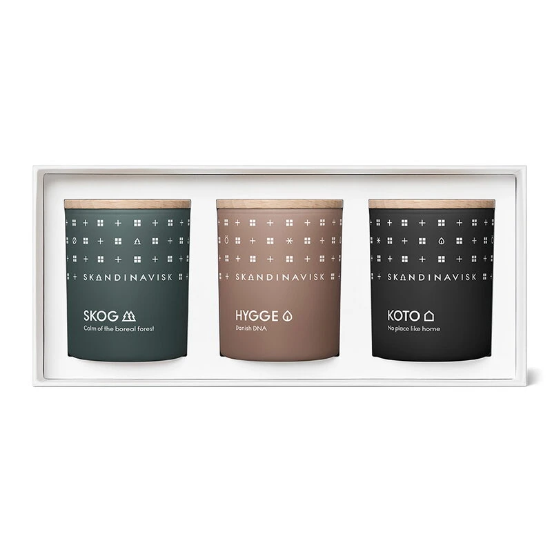 Das Duftkerzen-Geschenkset Hibernate von Skandinavisk enthält drei kleine Duftkerzen mit Düften, die von der nordischen Natur inspiriert sind. Die Kerzen werden in einer schönen Geschenkbox geliefert, haben einen Holzdeckel und eine Brenndauer von etwa 20 Stunden.