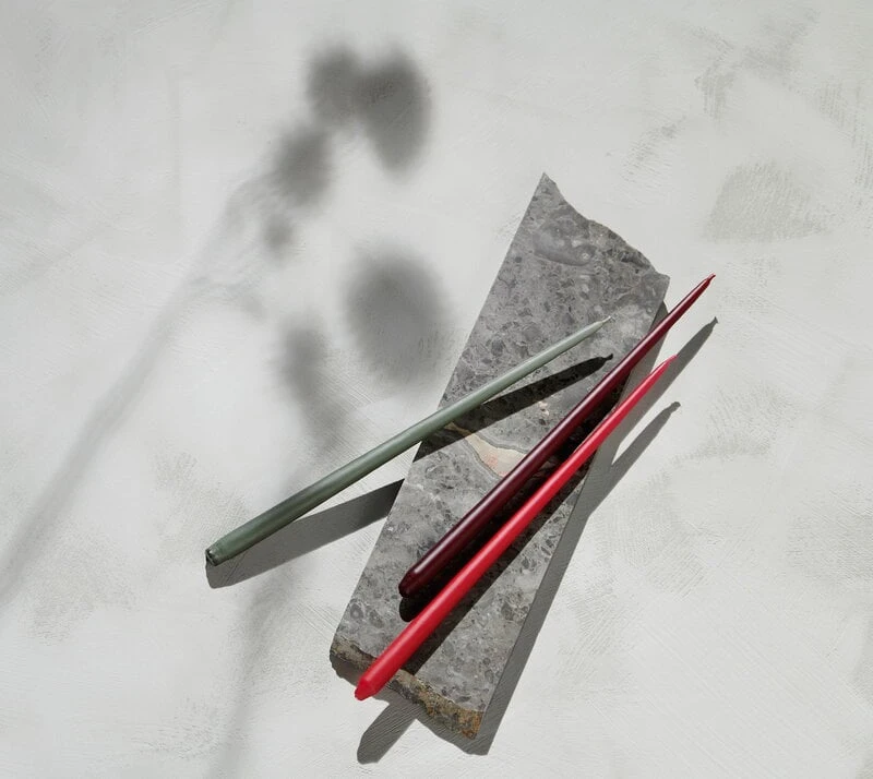 „STOFF Nagel by Ester & Erik“-Kerzen werden von einem dänischen Familienunternehmen namens Ester & Erik handgefertigt. Die Packung enthält 6 burgunderrote Stabkerzen, die für die STOFF-Nagel-Kerzenhalter entworfen wurden.