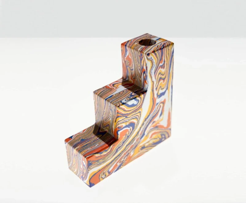 Wie andere Produkte aus Tom Dixons Swirl-Kollektion bestehen die Buchstützen aus verschiedenen geometrischen Formen, die übereinander gestapelt werden und mehrdimensionale Skulpturen bilden. Alle Swirl-Produkte werden aus Abfällen aus der Marmorverarbeitung hergestellt, die mit Pigmenten und Harz vermischt wurden. Die Blöcke werden dann zersägt, in Scheiben geschnitten und zu neuen Objekten zusammengesetzt. Dank dieses Herstellungsverfahrens hat jede Swirl-Buchstütze ein einzigartiges Muster.
