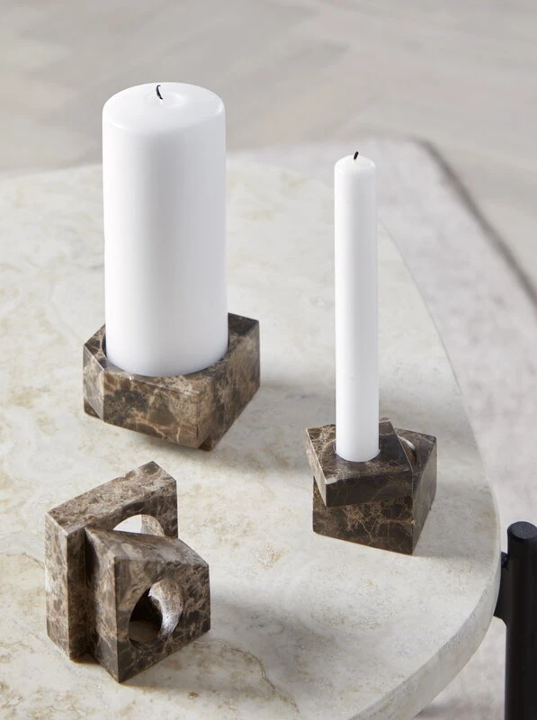 Der Kerzenständer wurde von Oleg Pugachev entworfen und besteht aus braunem Marmor. Das natürliche Material verleiht dem Ganzen eine reizvolle Individualität, da Muster und Farbe des Marmors von einem Kerzenhalter zum anderen variieren.